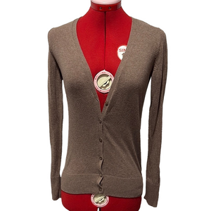 This Old Navy cardigan in a warm brown shade features a classic V-neck and a fine knit texture, ideal for layering in cooler weather. Its slim fit offers a sleek silhouette, making it a versatile piece for any wardrobe.