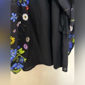 Flowy 100% silk swing dress with dainty wildflower print. Flutter style flared 3/4 sleeve. Fully lined with tie back and pockets.