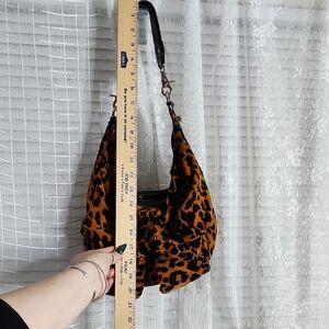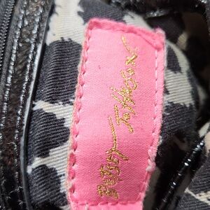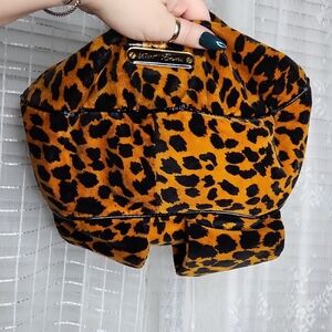 Vintage Betsey Johnson Velvet Leopard Print Purse W/ Bow, Studs and Patient Leather Trim and Handle. This bag has some cracks in the trim and discoloration on the velvet due to wear (see pics) otherwise in good vintage condition.
