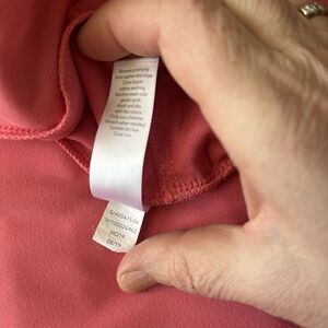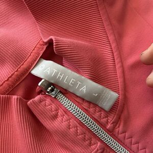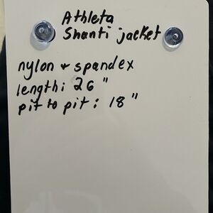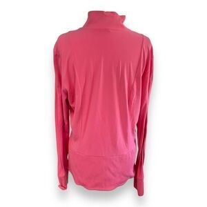 Athleta Powervita Shanti Jacket in Coral Petal, Size Large. Buttery soft stretchy powervita fabric is nylon and spandex. Pockets, thumb holes, mock neck. Excellent used condition - no flaws detected. See photos for fabric tag and measurements. Approximate pit to pit: 18”; length: 26.”