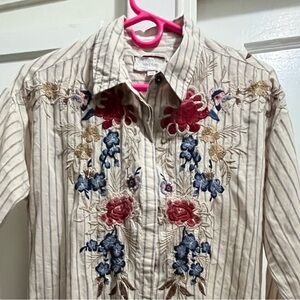 This Johnny Was Workshop Embroidered Striped Button-Down Tunic Dress is an XS , made of Cotton blend and in Good used Condition, no rips or stains please use approximate measurements to ensure proper fit and pictures as they are the best descriptors.
