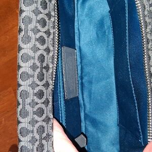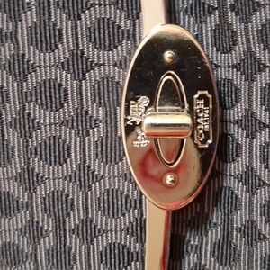 This elegant Coach handbag features a sophisticated black and gray design, perfect for any occasion. Crafted with attention to detail, it offers both style and functionality. Outside in front of the bag has one pocket with turn lock closure, black leather on both sides, black leather handles, black leather trim,black canvas background with gray C's signature,zipperclosure. Inside the bag has one medium pocket, one zipper pocket, blue interior. No stains, no peeling, no snags,no cracking, clean inside and out,in great condition.