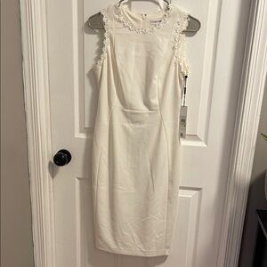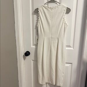 Chic sleeveless midi dress by Calvin Klein. Features a refined ivory color. Perfect for versatile styling.