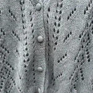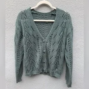 Stay cozy and stylish with this green knit cardigan sweater. Perfect for layering, this sweater features a delicate knit pattern and button-up front.