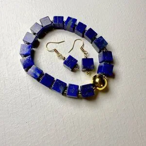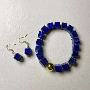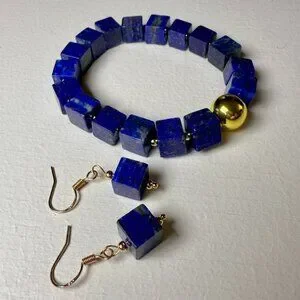 Handmade set featuring royal-blue lapis lazuli cubes with light gold accents.