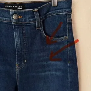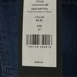 Size 30. MSRP $268 Brand new with all tags attached. Style: Ryleigh # J22094850642 Wash is "Bright Blue" High rise, 5 pocket style. Zip fly, button closure. Has stretch: 92% Cotton, 6% Polyester, 2% Polyurethane. Made in USA. There are 2 TEENY TINY dark marks on the front. They are in the fabric. See last 2 photos. Really not noticeable in my opinion since the denim is dark and the marks are small. This is how they came when I bought them.
