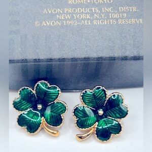 These 1992 Avon pierced earrings feature a stunning four-leaf clover design with rich green enamel set in a warm gold setting. I see no imperfections and are in great condition. The original box is included with cotton the earrings have been stored in. These elegant earrings are perfect to wear for St Patrick’s day and for good luck everyday. A lovely addition from 1992 to your vintage collection too.