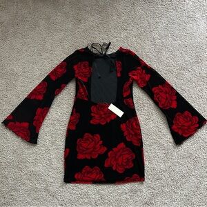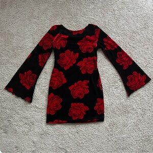 thirty thirty la dress, black red floral dress, bell sleeve mini dress, mesh overlay dress, bodycon mini dress, floral bodycon dress, red rose print dress, xl floral dress, evening mini dress, party night dress, date night outfit, holiday floral dress, gothic floral dress, romantic bell sleeve dress, stretchy bodycon dress, fitted floral mini, bold red rose dress, trendy mesh dress