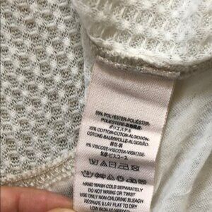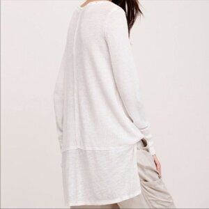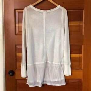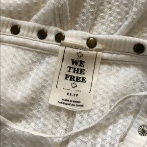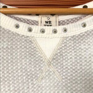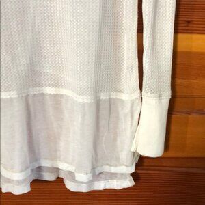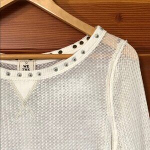 Brand new, never worn, no tags. Free People line We The Free flowy oversized sheer waffle knit tunic thermal top. Color is white ivory. Soft and comfy long sleeve thermal tee featuring cute stud details around the neckline. Distressing at the seams and bottom fabric with side vents creates a layered, lived-in look. Small run in fabric, see photos. Burnout fabric, metal studded collar, long sleeves, straight high-low hem with side slits. Size S. Box S6.