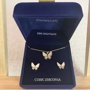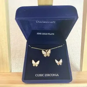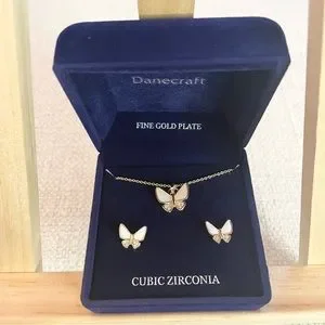 NWT butterfly finegoldplate cubic zirconia, gold & white earrings, necklace