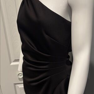 Beautiful scuba crepe one shoulder gown. Cascading ruffle down one side. Dress is fully lined with a back hidden zipper. There is stretch in the fabric.