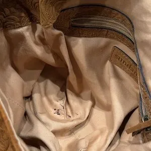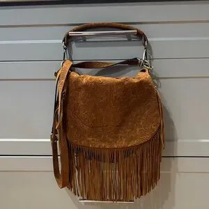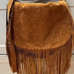 Tan suede shoulder bag with on trend fringe / western detail! Very good condition except for a few interior pen marks shown in photos. Suede is soft and beautiful! Made in Italy.