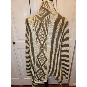 Olive green and ivory stripe sweater by Miracle USA is made from a luxurious cotton/cashmere/nylon blend. Sweater has an oversized fit and fits more like a poncho than a sweater. Front features a timeless striped design and is trimmed in a dramatic fringe. Back is accented by a Southwestern inspired pattern.