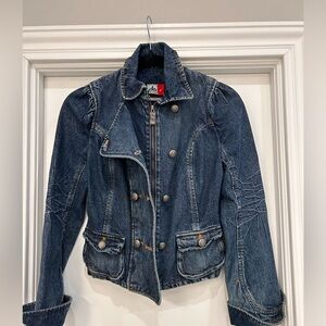 Stylish double-breasted denim jacket with a classic design. Perfect for casual outings and versatile styling. EUC. Size S.