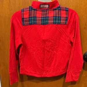 Bright red hoodie with plaid shoulder details. Features a quarter-zip front.