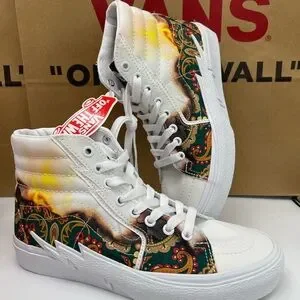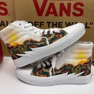 Vans high-top sneakers with a striking paisley pattern. Predominantly white with vibrant designs.