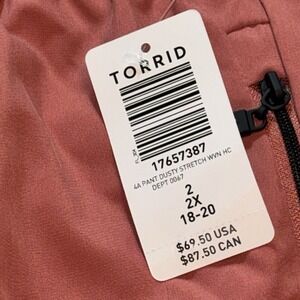 These Torrid Happy Camper Stretch Woven Active Pants are new with tags and in excellent condition. The color is called dusted clay. These are made of 91% polyester and 9% spandex. These are machine washable. These pants feature two front zipper pockets and a wide waistband that will help smooth your middle section. The approximate measurements are: