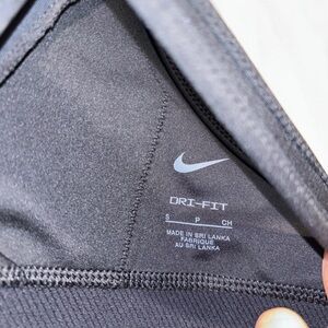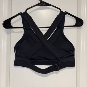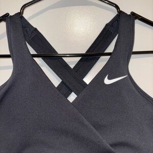 Sleek black design with cross-back straps. Ideal for active wear. Nike logo on front.