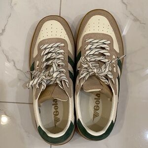 Stylish Gola sneakers with green and cream design. Tan suede details. Perfect for casual wear.
