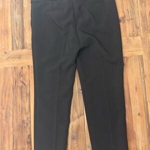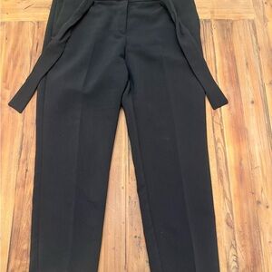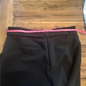 Sleek black pants with a stylish tie-waist. Good quality, well made and flattering. Made of Polyester, Rayon and Spandex.