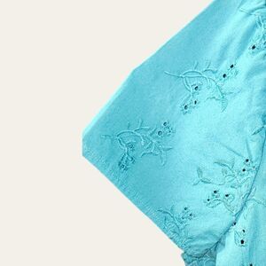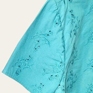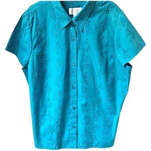 Womens Plus Size Short Sleeve Open knit floral design blouse. Plus Size 2X Bust: 52" & Length: 26.5". All measurements are approximate. The color is a teal green. Due to camera & or lighting, the item may appear darker or lighter than it actually is. 🤔