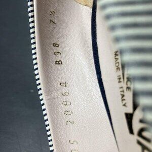 Salvatore Ferragamo Navy/White Stripe Peep-Toe Heels – Size 7.5B, Bow Accent