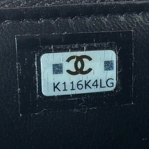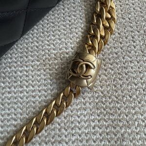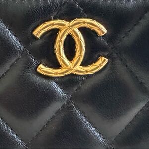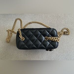 Chanel lambskin crossbody bag in black quilted design. Features gold chain strap and logo. Elegant and timeless.