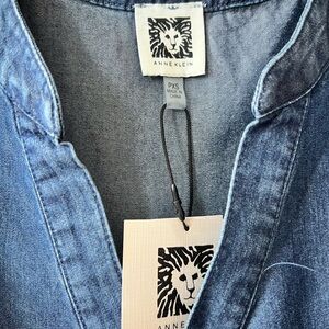 This elegant blue blouse by Anne Klein features a mandarin collar and 3/4 length puff sleeves, offering a relaxed yet fitted silhouette. The blouse's stylish design is perfect for both casual and semi-formal occasions, making it a versatile addition to any wardrobe.