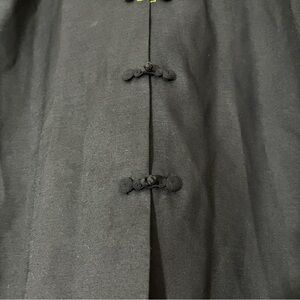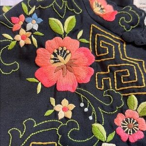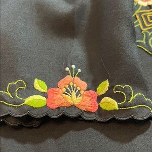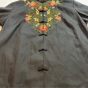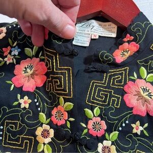 Elegant black top with high neck, vibrant and intricate floral hand embroidered details, darling scallops on the sleeves and neckline. It has chinese knot buttons, item was made in Shanghai, it is a women's M. Item is preowned and has an incredibly small spot on the front and a small snag in the back.