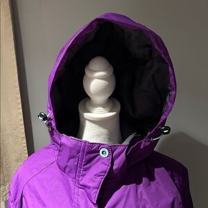Vibrant purple jacket with black accents. Features a hood and zippered pockets. Ideal for cold weather.