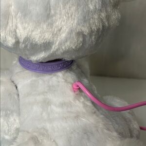 Features large blue eyes, a pink bow, and soft white fur. Comes with a turquoise and purple remote control connected by a pink cord—used to activate movement and sounds.