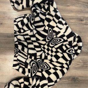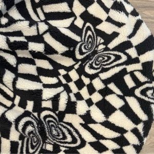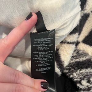 Cozy teddy jacket with bold black and white pattern. Features a zip-up front and high collar. Perfect for stylish warmth.