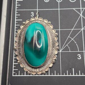VTG Victorian Revival Jerusalem 925 Silver Pendant 2.75" Green Glass Cabochon