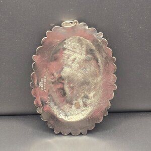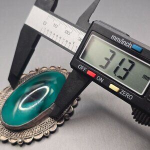 This vintage pendant is a stunning example of Victorian Revival design, featuring ornate filigree, scalloped edges, and a bold green glass centerpiece. Marked ‘Jerusalem Silver’ on the reverse, it blends romantic styling with mid-century craftsmanship.
