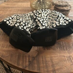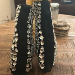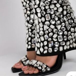 Catch all the lights in The AZALEA WANG Stopping The Whole Show Stiletto Sandal In Black! This trendy sandal-boot hybrid features a clear gem-detailed foldover stretch knit upper, a mid-calf shaft height, and a slim stiletto heel. Complete with a square open toe, clear gem-detailed toe strap, and a slip on fit. - Mid-calf height shaft - Square open toe - Stiletto heel - Clear gem exterior - Knit upper - Step-in fit - 7" shaft height - 3.75" heel height