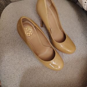 Vince Camuto high heel tan rounded toe 4 inch heels size 8.5, stylish shiny tan heels great with jeans or dressed up with a dress, skirt, or even formal gown. Vince Camuto brings the art of heels to these pumps with the accentuation the round toe. Everyday heels, laid back, comfy relaxed effortless, simple, versatile breathable, lightweight basic comfy, conservative polished classic minimalist fun free spirited, summer ready effortless, eye catching and common. Retro and classic these heels are in great condition and perfect for any closet.