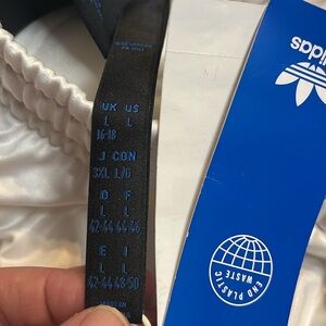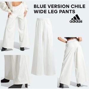 NWT-Adidas-L-white-originals blue version chile 62 wide leg trefoil track pants. IL8537. Elastic waist with drawstring inside. Two front zipper pockets, one back zipper pocket. Embroidered logo on back pocket and on front cuff. Stripes down the sides. Step out in style with these elegant white wide-leg pants. Perfect for any occasion, these pants offer a chic and comfortable fit. see photos for more product information. Athletic, streetwear, festival, hip-hop.