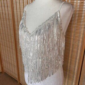 12th Tribe white sequin fringe tank top with adjustable straps and back zipper closure. Has some self tan straining inside but would probably come out with some bleach. Cant see the staining while the top is on. No stretch.