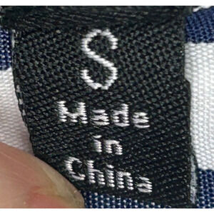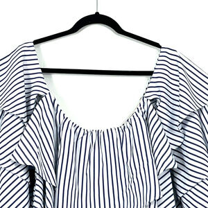 This is an adorable INA blouse for women in size small. It features a stylish blue and white striped pattern, an off-shoulder design, and tiered ruffles. Perfect for a casual day out or a fun evening event!
