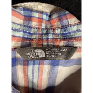 Measures 21” P2P and 28” long. This North Face Women's Plaid Long Sleeve Button-Up Shirt in XL features a collared neckline, button closure, and is suitable for casual or workwear occasions. Made from 100% cotton fabric, this shirt is easy to care for and machine washable. The shirt comes in a multicolor orange, white, and blue plaid pattern, with roll tab sleeves ideal for all seasons. With a preppy and outdoor theme, this shirt from The North Face is a stylish and versatile addition to any woman's wardrobe, offering comfort and style for everyday wear.