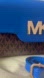 Elegant satchel with blue top and brown patterned body. Features gold-tone logo and hardware. Ideal for chic styling.