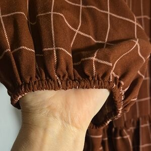 * New with Tags * Chic brown & pink plaid blouse with V-neck and button front. Puff sleeves and peplum hem add style.