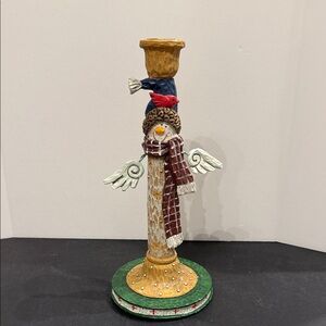 Charming snowman candle holder with colorful details. Features a red scarf and green base. Good used condition- see pics for size/condition.