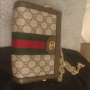Elegant Gucci wallet with iconic monogram. Features beige and brown tones. Green and red stripe accent. Gold chain detail.