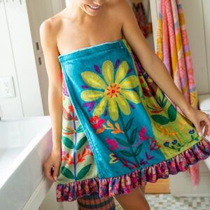 Lightweight, absorbent, and comfy with an elastic waistband for an easy fit. Elastic waistband. Wrap-style towel skirt. Ruffle hem. Colorful floral print with LOVE detail. Great for spa days, beach/pool cover-up, dorm living, or self-care routines.