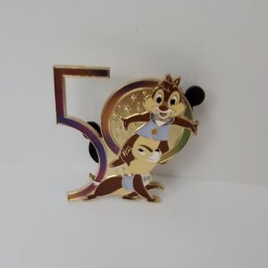 Charming Disney pin featuring Chip and Dale. Gold and purple accents highlight the playful design of the 50th anniversary celebration of WDW's Magic Kindgom.