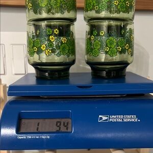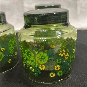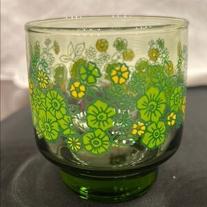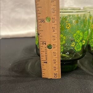 Retro/ vintage. Set of four glasses with vibrant green and yellow floral design. Perfect for adding a touch of nature to your table setting.