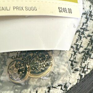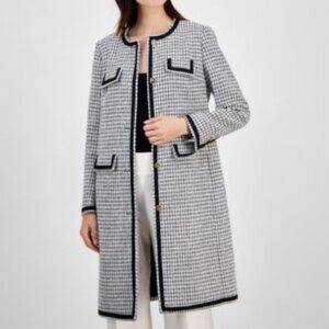 Timeless elegance meets modern sophistication in this stunning tweed coat from Anne Klein. Features classic collarless design with contrasting black trim, decorative front pockets, and button-front closure. The longline silhouette creates a polished, elongated look perfect for elevating any outfit. Versatile piece that works beautifully over dresses, suits, or casual wear. Anne Klein quality craftsmanship at a fraction of retail. New with tags!