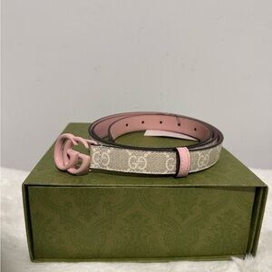 Stylish Gucci belt with iconic design. Pink and cream colors for a sophisticated look. Perfect for any ensemble.