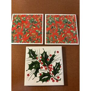 This set of 3 vintage Christmas trivets features a festive design with red and green holly berries on ceramic material, perfect for adding a touch of holiday cheer to your kitchen. Made in 1990, these trivets are ideal for collector's of holiday memorabilia and make a stylish addition to your Christmas decor.